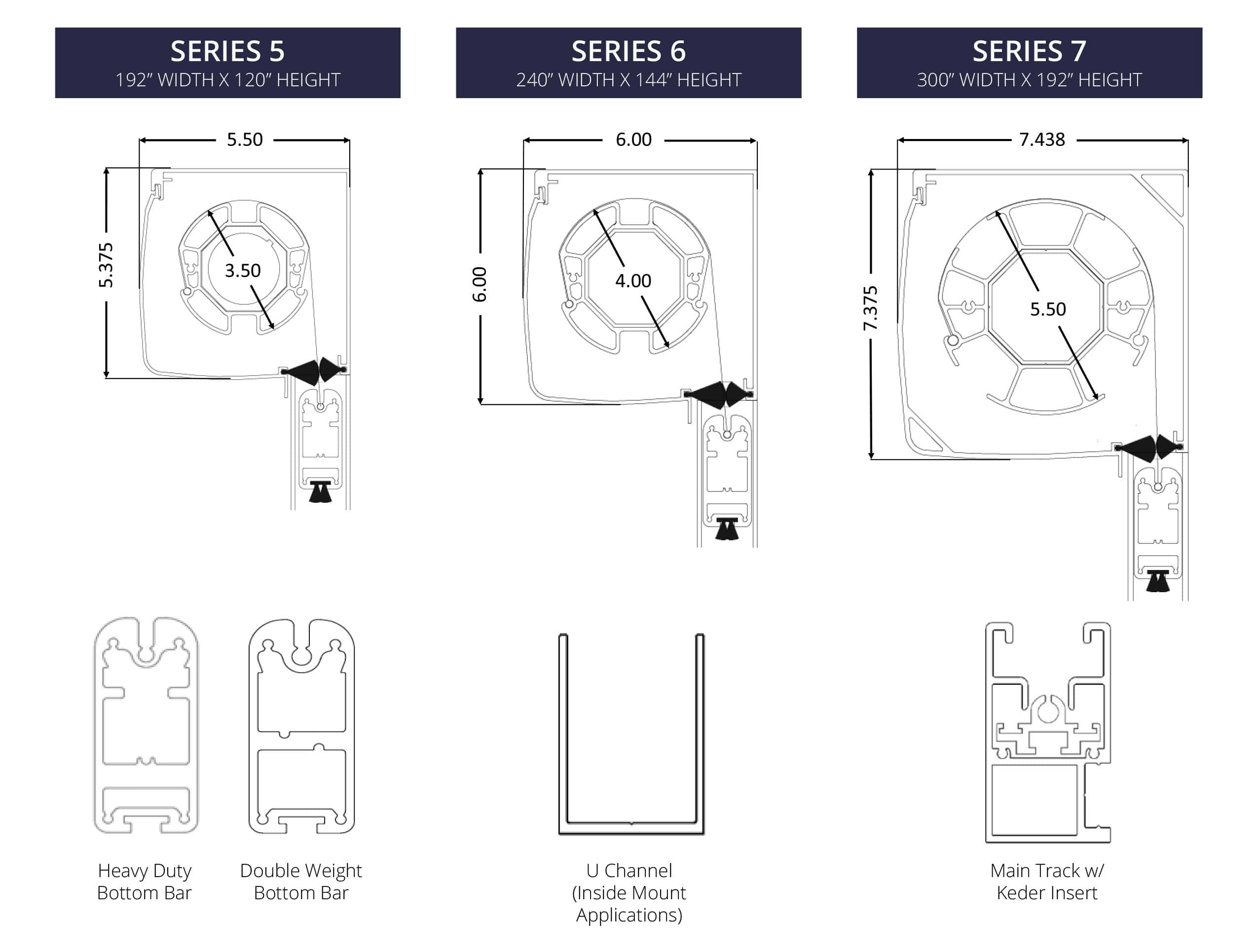 - 3 Housing sizes for shades from 3 ft up to 25 ft in width and up to 16 ft in height.